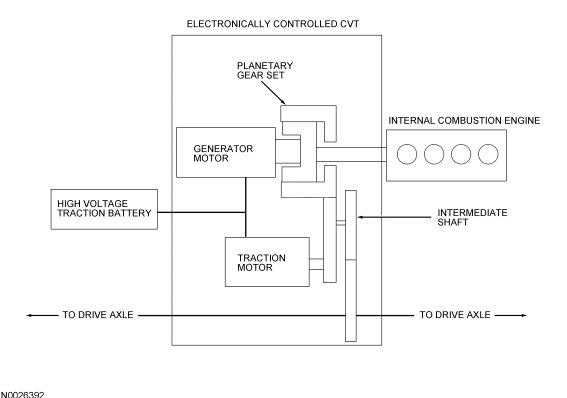 The primary objective of the electronically controlled CVT is to deliver torque to the drive axles of the vehicle. The CVT transmits input torque from the internal combustion engine, or uses electrical power from the high voltage traction battery. The electrical power is converted into mechanical power by the traction motor and the generator motor. The electronically controlled CVT operates in several different modes, and under certain conditions can transmit power from the traction motor and engine simultaneously or independently. For additional information, refer to Hybrid Electric Control Software, operating modes.