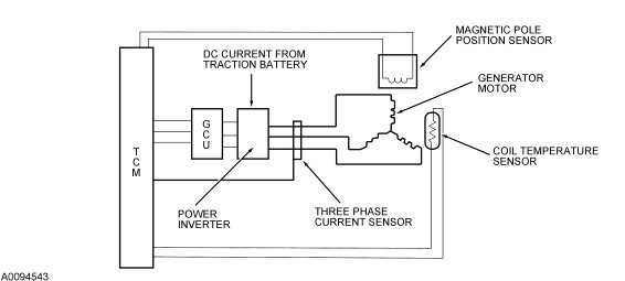 The generator motor is a three-phase permanent magnet AC motor connected to the sun gear of the planetary gear set. The generator power inverter (internal to the transaxle) receives a DC current from the high voltage traction battery. The DC current is inverted to an AC current, which is controlled by the TCM and the generator control unit (GCU). Depending on the mode of operation, the generator motor can rotate in the same (clockwise) or reverse (counter clockwise) direction as the internal combustion engine. The TCM also monitors generator position, speed, phase current, power inverter temperature, coil temperature, and voltage. It processes a variety of PCM and traction battery control module (TBCM) inputs to determine generator function. The inputs are divided into two categories: the hardwired signals and the network messages. The inputs used to determine generator function include the total torque desired, the engine speed desired, the generator mode, the generator shutdown, and the vehicle mode. The generator operates in one of the following generator modes: torque, speed, engine cold start, engine normal start, engine high speed start, and engine enhanced speed control stop. The generator is used as a starter for the internal combustion engine, charges high voltage traction battery, and controls engine speed. The TCM reports the generator error status to the PCM. The PCM initiates an appropriate limited operating strategy (LOS) mode and sets the diagnostic trouble code (DTC) P1A0D (Hybrid powertrain control module - generator disabled) based on the error status it received. The TCM also sets a DTC which indicates the cause of the generator motor concern.
