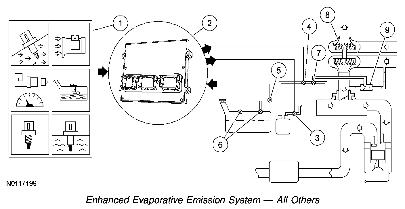 The enhanced EVAP system consists of a fuel tank, fuel filler cap or capless fuel tank filler pipe, fuel tank mounted or inline fuel vapor control valve, fuel vapor vent valve, EVAP canister, fuel tank mounted or fuel pump mounted or inline fuel tank pressure (FTP) sensor, EVAP purge valve, EVAP check valve (turbocharged engines only), intake manifold hose assembly, EVAP canister vent valve, PCM and connecting wires, and fuel vapor hoses. The enhanced EVAP system, including all the fuel vapor hoses, can be checked when a leak is detected by the PCM. For additional information on the EVAP system components, refer to Engine Control Components.