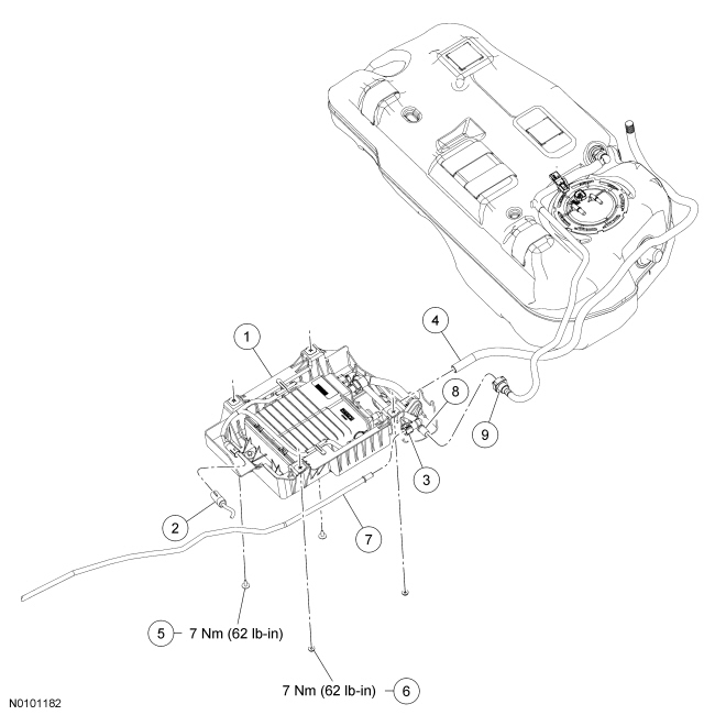 7. Remove the 2 nuts, 2 bolts and the EVAP (Evaporative Emission) canister assembly.