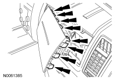 Through the glove compartment opening, release the passenger air bag module deployment door clips while pushing the passenger air bag module out of the instrument panel.