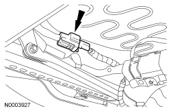 7. From under the rear of the passenger seat, slide and disengage the passenger seat side air bag module electrical connector locking clip, and then release the tab and disconnect the passenger seat side air bag module electrical connector.