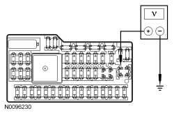 - Measure the voltage between SJB (Smart Junction Box) fuse 28 (5A), circuit CBP28 (GY/VT), output side and ground.