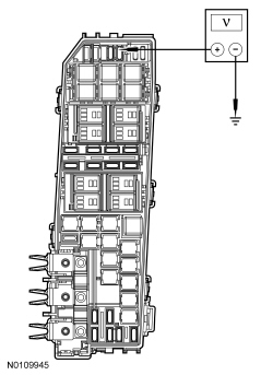 - Measure the voltage between SJB (Smart Junction Box) C2280B-2, circuit CBP28 (GY/VT), harness side and ground.