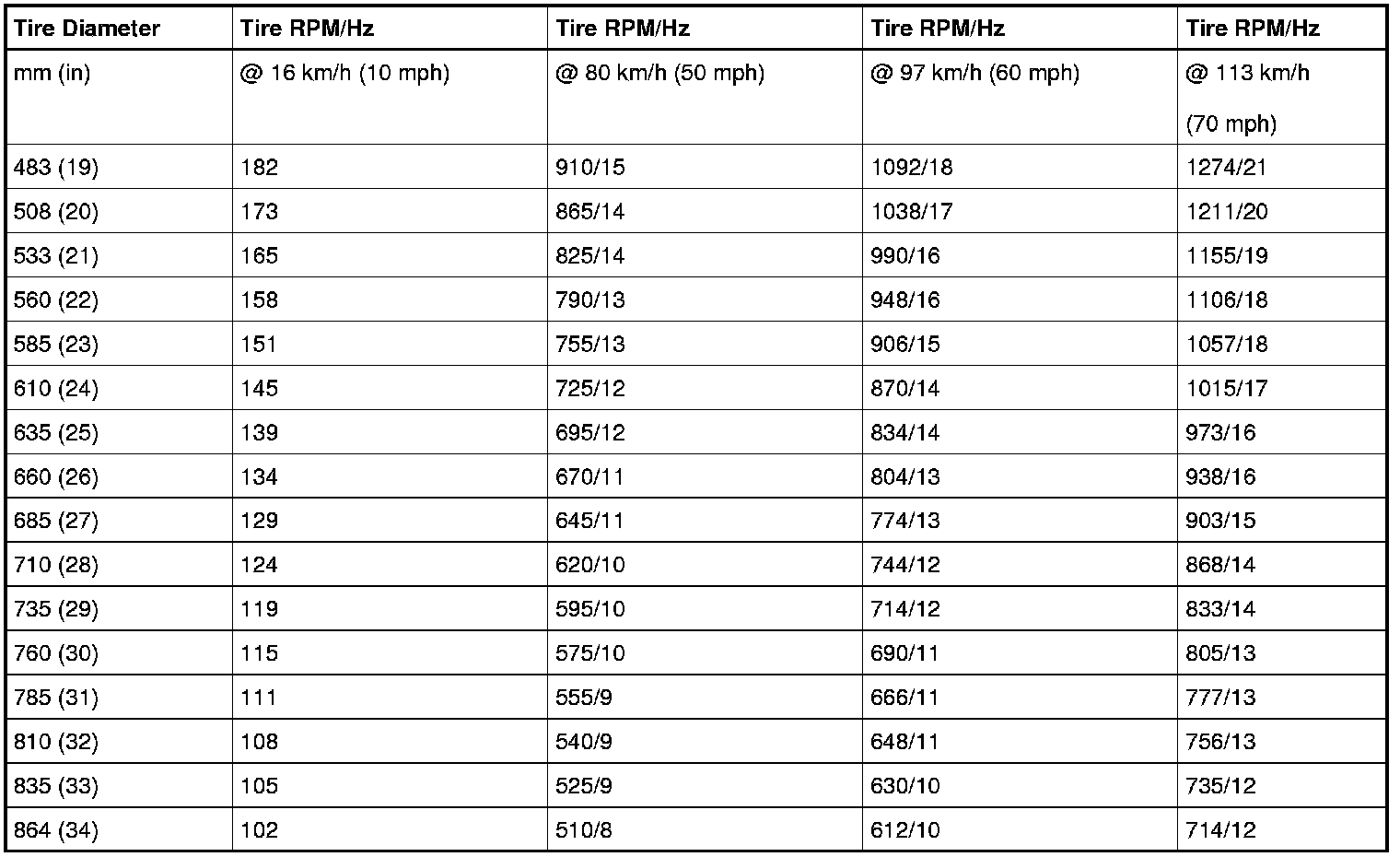 - If the vehicle speed is not listed, calculate the tire and wheel frequency as follows:
