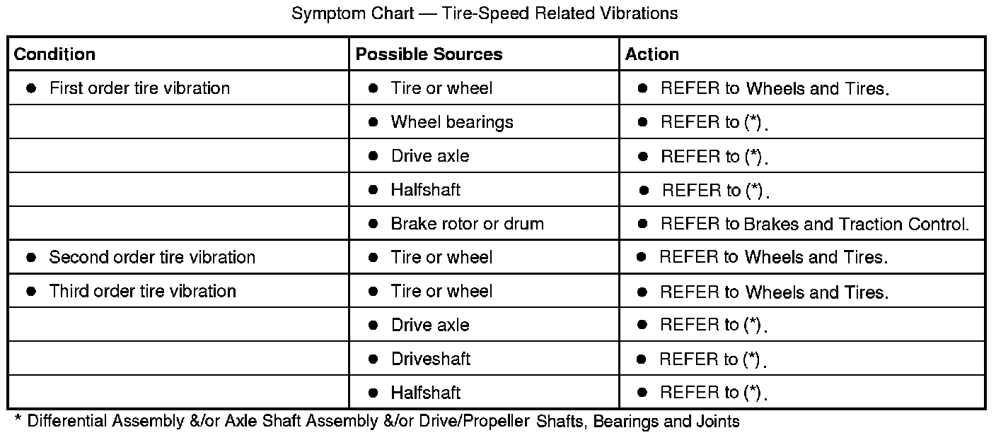 Use the diagnostic instructions along with the necessary listed tools to identify the vibration order and to isolate the symptom and the possible systems associated with that symptom. Then based on the results from the road test, make a determination of which action in the symptom chart to take first. Since it is possible any one of multiple systems may be the cause of the symptom, it may be necessary to use a process of elimination type diagnostic approach to pinpoint the concern. Refer to the system(s) indicated to identify and isolate the cause or rule that system out as being the causal system for the symptom.