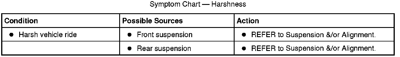 Harshness is customer perception which gives the impression of no isolation from the tire/wheel and suspension system. Harshness may be caused by road conditions, temperature changes, component damage and/or incorrect customer modifications on original components/specifications. Customers usually experience harshness when the vehicle is driving over bumps or potholes and in cold weather conditions. Harshness can also be experienced with excessive tire pressure, sporty tires, heavy-duty springs and shocks, or other vehicle modifications. Some aftermarket tires, even with the correct size, may change vehicle behavior and produce customer concerns. The first step in diagnosing a harshness concern is to determine if the concern was experienced only in certain specific operating conditions, such as large potholes or extremely cold weather. In these cases, harshness should be considered normal. A known good vehicle can be driven under the same conditions and the rides can be compared to determine whether the concern is normal or vehicle specific. The second step is to check tire pressure and make sure it was set within vehicle specifications. The third step is to inspect for aftermarket or modified components and determine if they are the cause of the harshness complaint. If the harshness concern persists after the above steps, it is possible that some components are damaged. Based on the results from the road test, make a determination of which action in the symptom chart to take first.