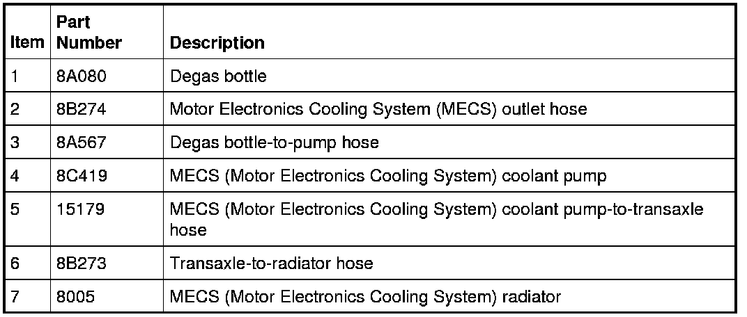 The MECS (Motor Electronics Cooling System) pump is an electric pump that runs any time the ignition is in the ON position. Unlike traditional cooling systems, there is no thermostat in the MECS (Motor Electronics Cooling System), so coolant flow should be continuous and considerably less than traditional powertrain cooling systems.