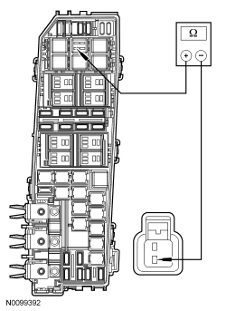 - Measure the resistance between MECS (Motor Electronics Cooling System) coolant pump C1466-2, harness side and PDB (Power Distribution Box) MECS (Motor Electronics Cooling System) coolant pump relay 31D, circuit CB108 (GY/YE) socket.