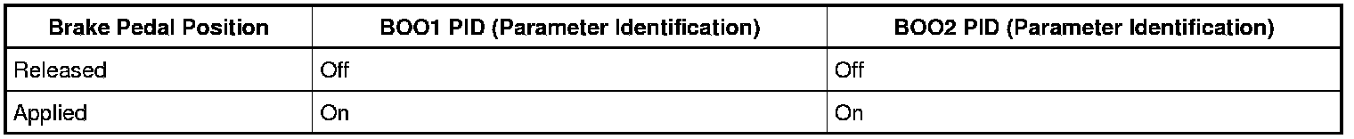 2. Monitor the powertrain PIDs (Parameter Identifications) BOO1 (stoplamp switch) and BOO2 (cruise control deactivator switch) while applying and releasing the brake pedal.