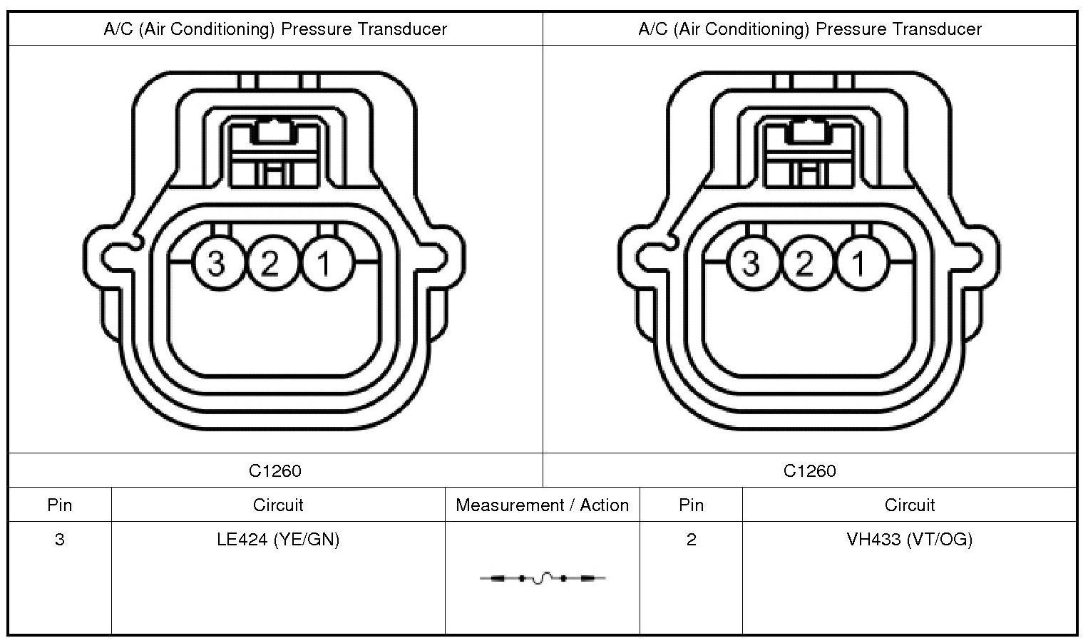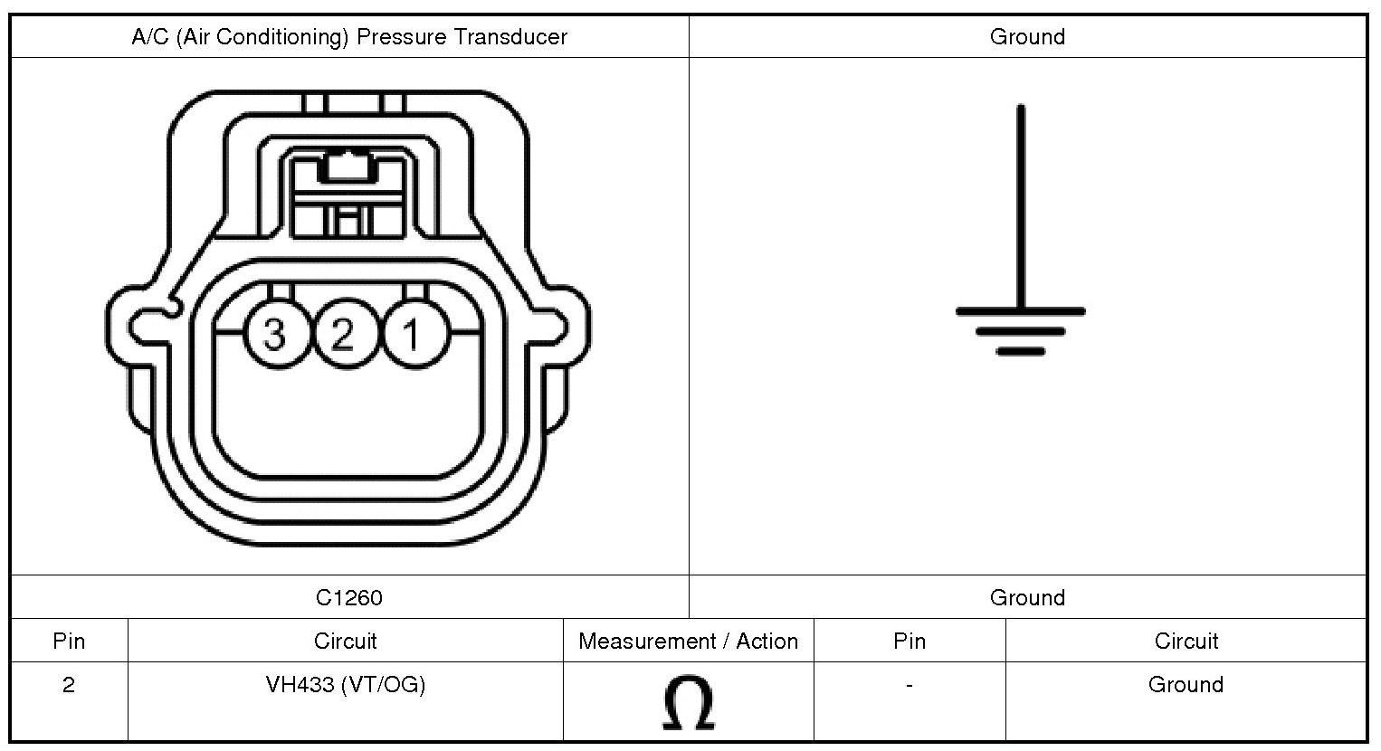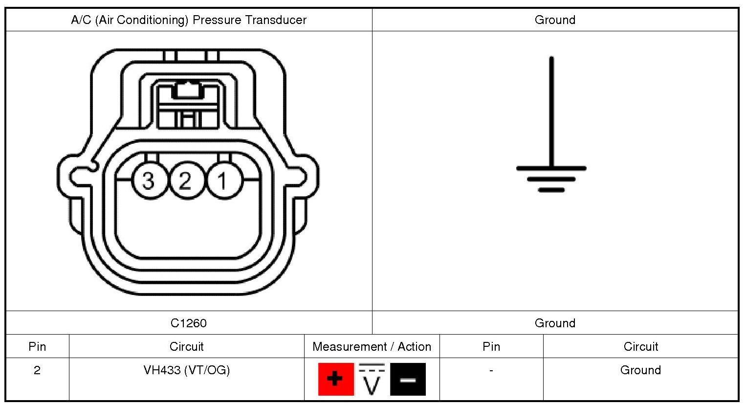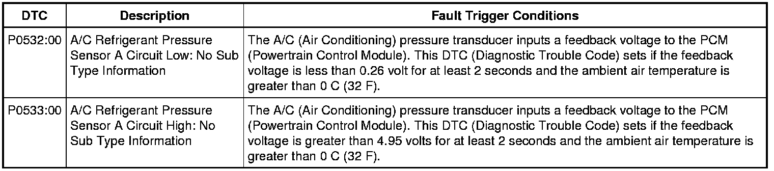 The A/C (Air Conditioning) pressure transducer receives a ground from the PCM (Powertrain Control Module). A 5-volt reference voltage is supplied to the A/C (Air Conditioning) pressure transducer from the PCM (Powertrain Control Module). The A/C (Air Conditioning) pressure transducer then sends a voltage to the PCM (Powertrain Control Module) to indicate the A/C (Air Conditioning) refrigerant pressure.