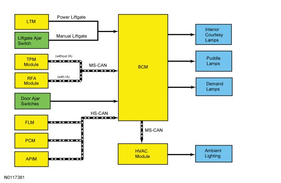 Based on the input received from the FCIM (Front Controls Interface Module) (user preferences) and the BCM (Body Control Module) (parking lamps on, illuminated entry/exit, open door) over the communication network, the HVAC (Heating, Ventilation, and Air Conditioning) module provides voltage to the ambient lighting LEDs (Light-emitting Diodes). The HVAC (Heating, Ventilation, and Air Conditioning) module also provides the ground source for the ambient lighting LEDs (Light-emitting Diodes).