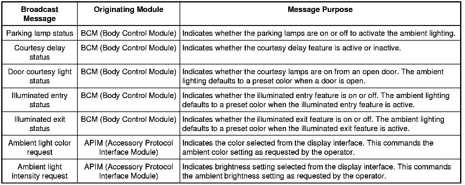 The APIM (Accessory Protocol Interface Module) uses software to monitor the user interface from the touchscreen. Based on the ambient lighting system selections made using the touchscreen, the APIM (Accessory Protocol Interface Module) sends ambient light color request and ambient light intensity request messages over the communication network for color and brightness settings. The HVAC (Heating, Ventilation, and Air Conditioning) module retains the last color and brightness setting between uses.