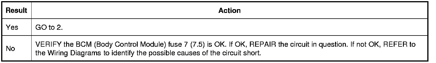 Verify BCM (Body Control Module) fuse 7 (7.5A) is OK.
