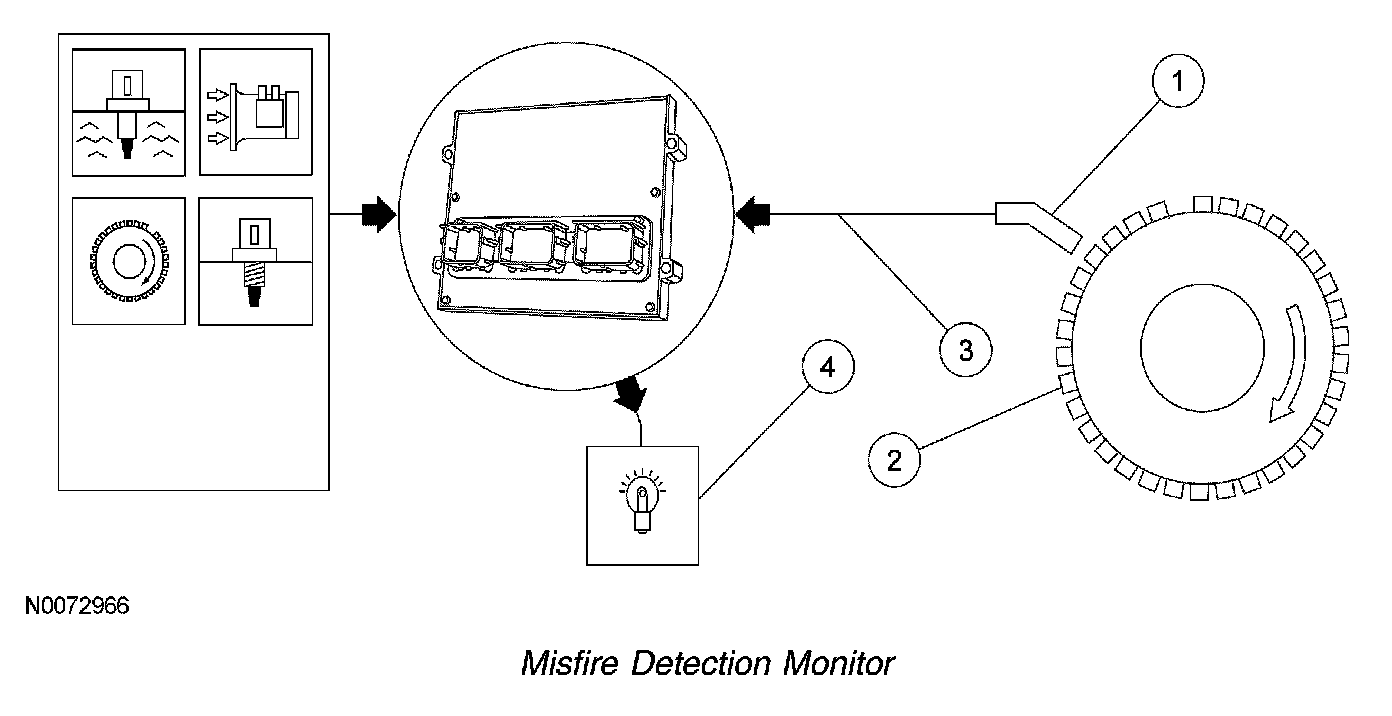 MISFIRE DETECTION MONITORThe misfire detection monitor is an on board strategy designed to monitor engine misfire and identify the specific cylinder in which the misfire has occurred. Misfire is defined as lack of combustion in a cylinder due to absence of spark, poor fuel metering, poor compression, or any other cause. The misfire detection monitor is enabled only when certain base engine conditions are first satisfied. Input from the engine coolant temperature (ECT) or cylinder head temperature (CHT), intake air temperature (IAT), and mass airflow (MAF) sensors is required to enable the monitor. The misfire detection monitor is also carried out during an on-demand self-test.