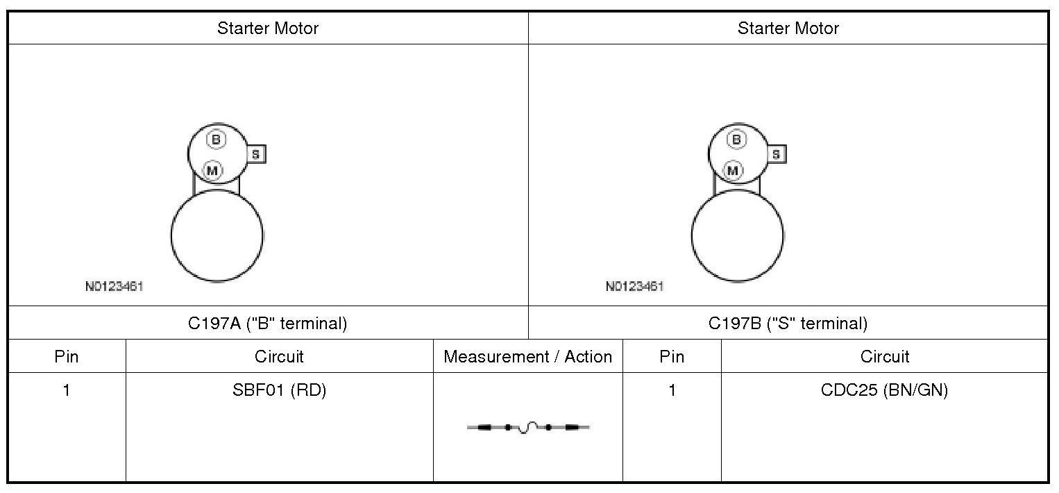 2. Disconnect: Starter Solenoid C197B ("S" terminal).