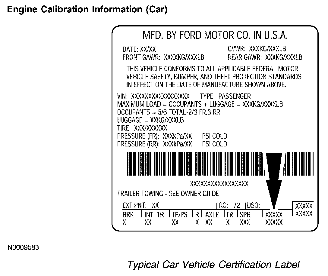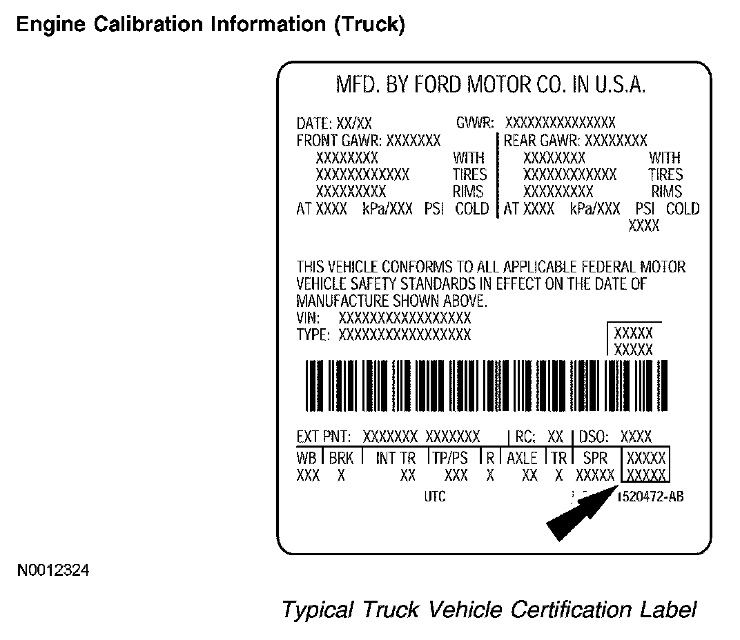 Base engine calibration information, sometimes referred to as the powertrain calibration, is located in the lower right corner of the vehicle certification label. Engine calibration information is limited to a maximum of 5 characters per line (2 lines maximum). Calibration information more than 5 characters long wraps to the second line of this field. Only the base calibration appears on this label. The revision level is no longer printed on the label. However, it can be found in the On-Line Automotive Service Information System (OASIS). For additional information on the vehicle certification label or engine calibration, refer to the Vehicle Identification Codes.