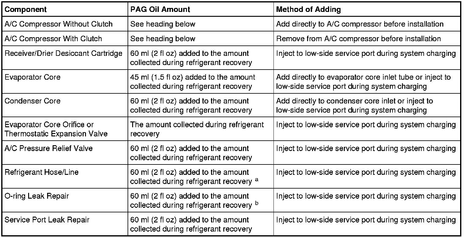 a If an excessive amount of refrigerant oil is lost due to a hose rupture/separation or other damage, the total system refrigerant oil capacity must be added.