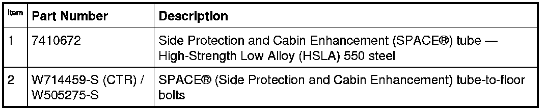 3. Remove the 6 Side Protection and Cabin Enhancement (SPACE(R)) tube-to-floor bolts and remove the SPACE(R) (Side Protection and Cabin Enhancement) tube assembly.
