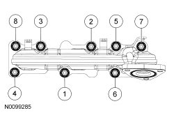 Install a new gasket, LH exhaust manifold and turbocharger assembly and 8 new nuts. Tighten the nuts in 2 stages in the sequence shown: