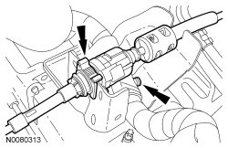 9. Detach the battery cable harness locator clip from the engine harness locator clip at the front corner of the LH valve cover.