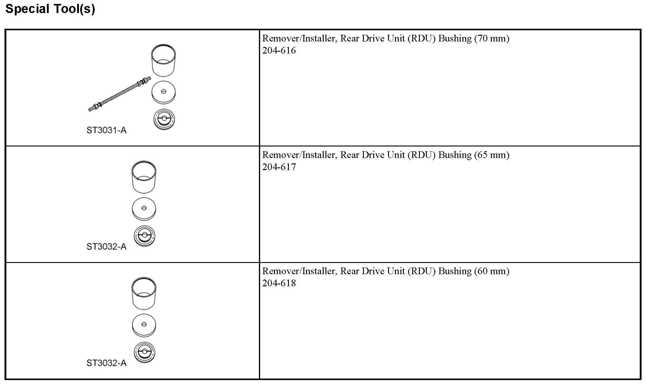 - When installing the RDU bushing, 204-617/2 will fall away as the RDU bushing is installed into the subframe. The Rear Drive Unit (RDU) Bushing Remover/Installer does not control the depth of the bushing, continue to tighten the nut until the RDU bushing is fully seated into the subframe.