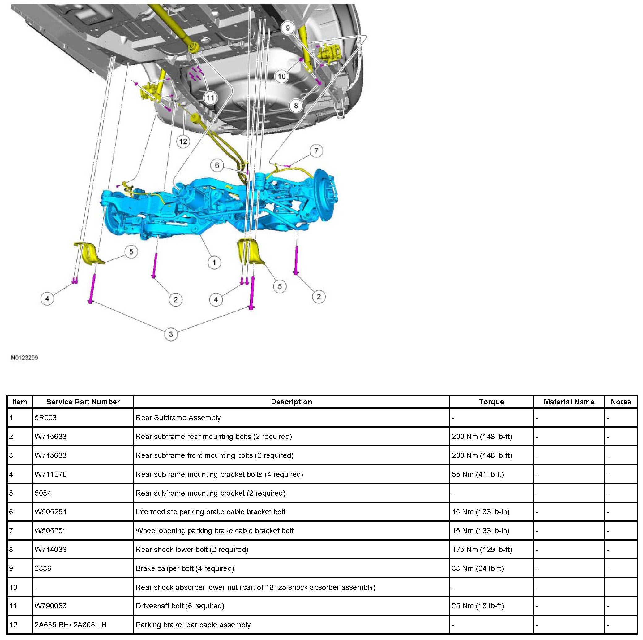 21. Remove and discard the 2 rear subframe assembly rearward bolts.