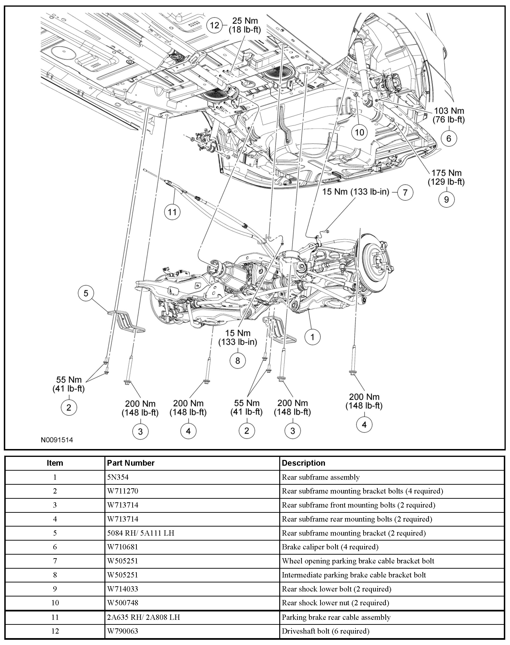 19. NOTICE: When positioning the lifting table, be sure to support the rear subframe on the subframe rails. Do not lift on the rear differential or rear control arms, damage may occur.