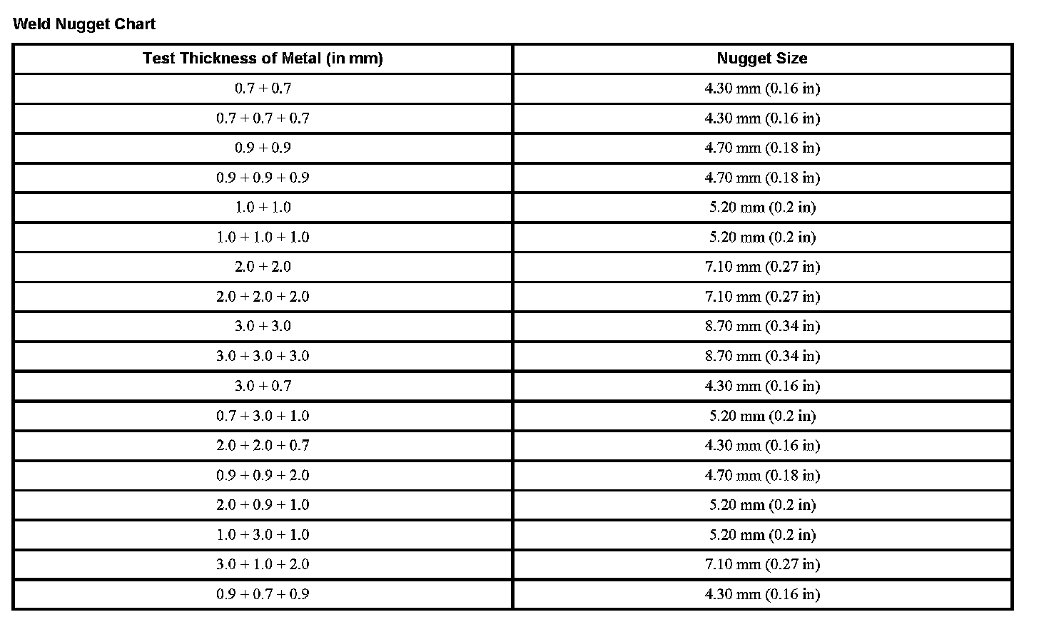 Weld Nugget Chart