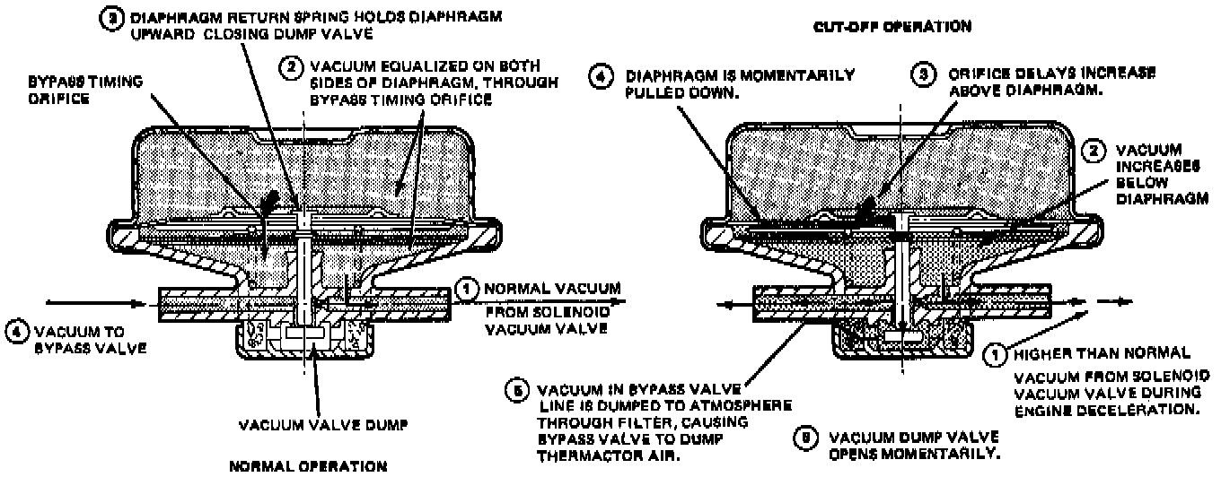 On 1975-82 vehicles with the Thermactor system and catalytic converters, a (VDV), Fig. 88, is used to control the operation of the air bypass valve. Under normal operation, vacuum applied through the VDV holds the valve upward, blocking the vent port and allowing Thermactor air flow. During acceleration or deceleration or in case of system failure, the VDV momentarily cuts off vacuum flow to the bypass valve, diverting the Thermactor air flow to atmosphere.