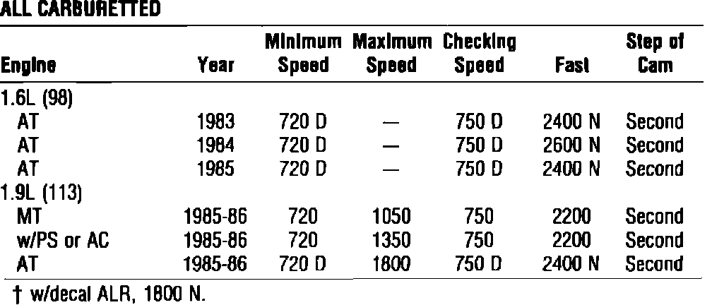 Carburetted Model, Idle Speed Specifications: