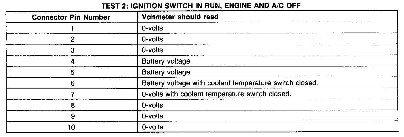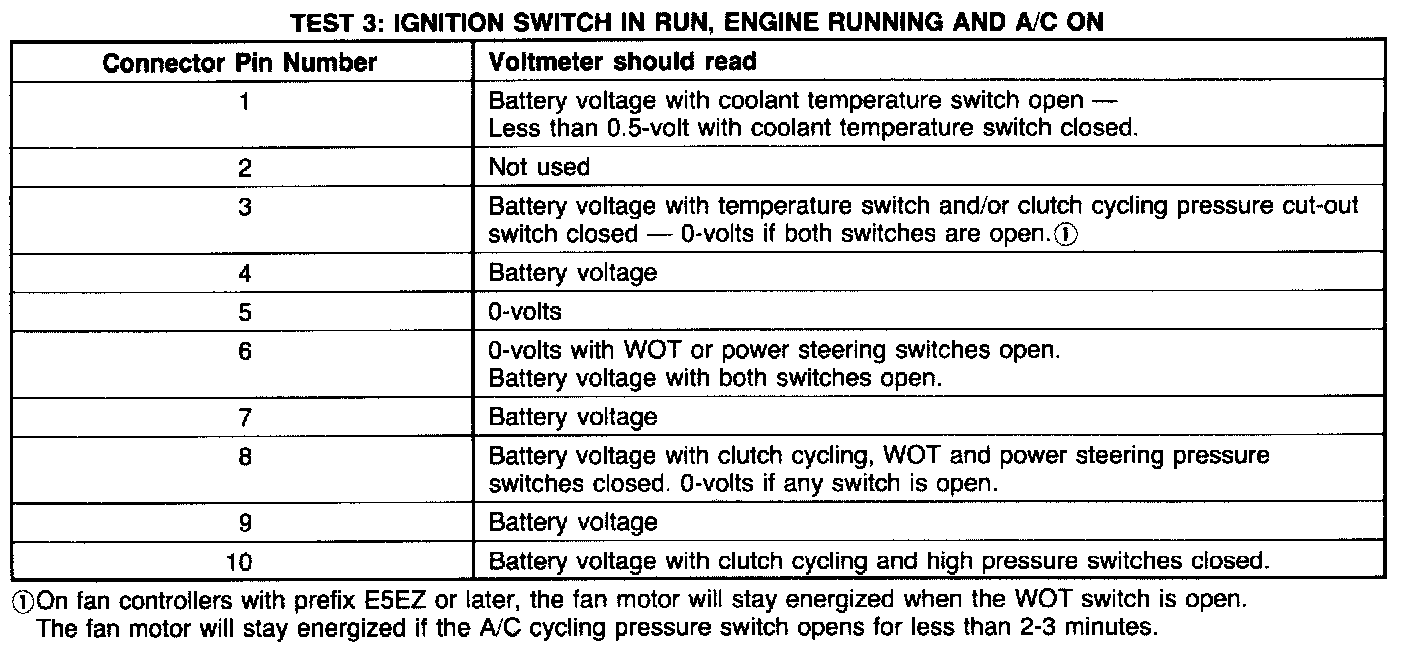 If it is suspected that the cooling fan controller is not operating properly, diagnosis of the controller can be performed by taking voltage/continuity readings at the controller connector with the connector plugged into the controller. The readings should be made during the following three tests: