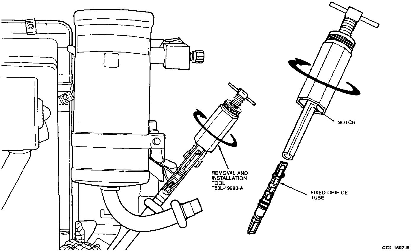 6. If the fixed orifice tube breaks in the evaporator core tube, it must be removed from the tube with the Broken Orifice Tube Remover T83L-19990-B or equivalent.