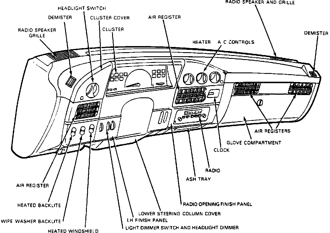 13. Using glove compartment and steering column openings for access, disconnect electrical connections, vacuum hoses, heater and A/C (if equipped) control cables and radio antenna cable.
