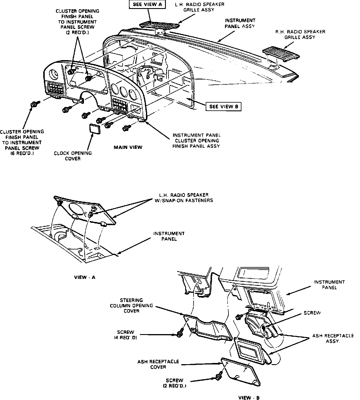 10. Remove radio opening finish panel attaching screw (in lower part of panel), then, remove radio finish panel by snapping out.