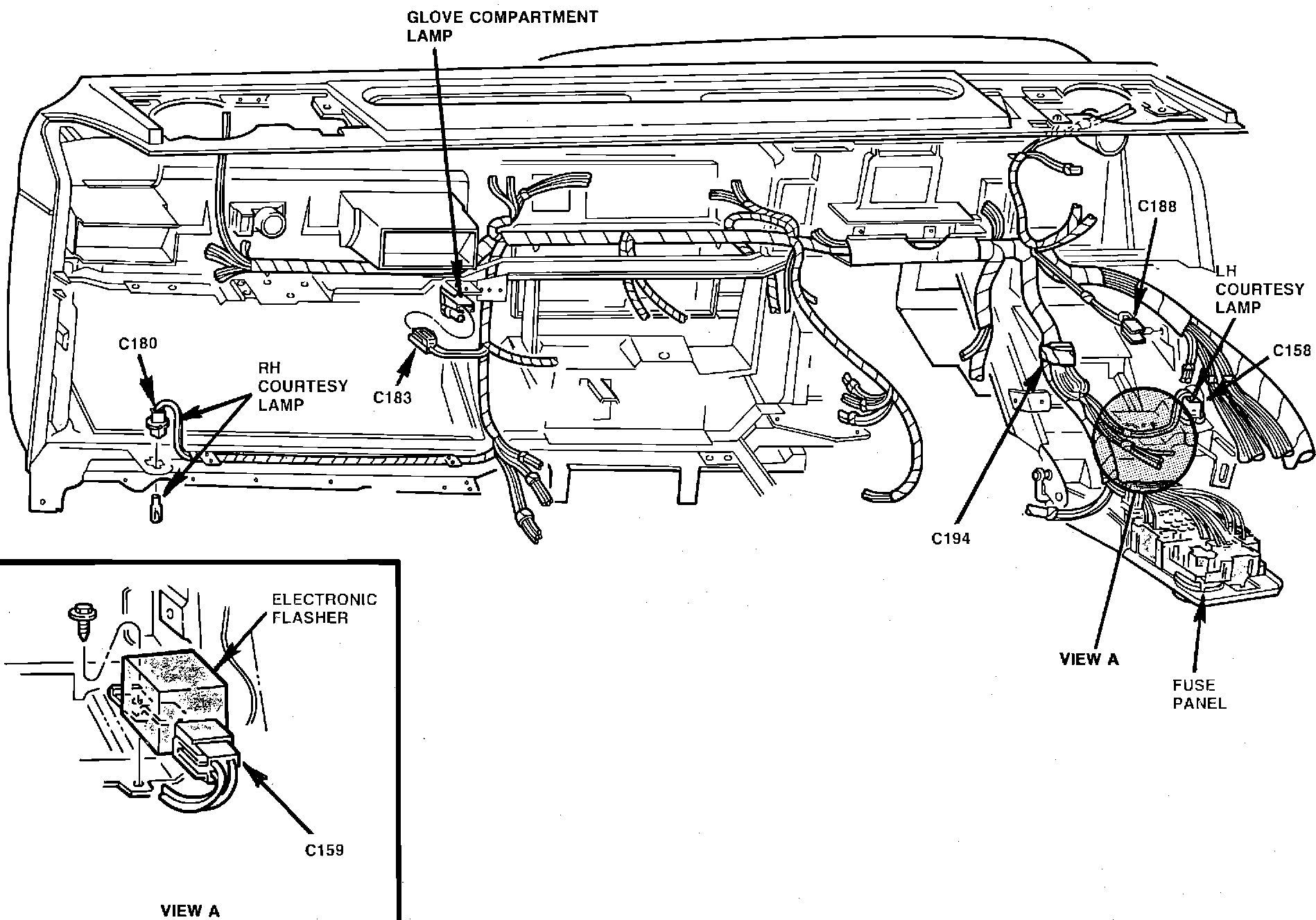 The Electronic Flasher can be removed by pressing the plastic retaining clip (attached to the Flasher housing) and pulling straight rearward. Installation of a new Flasher can be made by removing the bracket from the new unit, then aligning the existing bracket to the instrument panel with the track on the Flasher housing. Then push the Flasher forward until it snaps into the bracket.