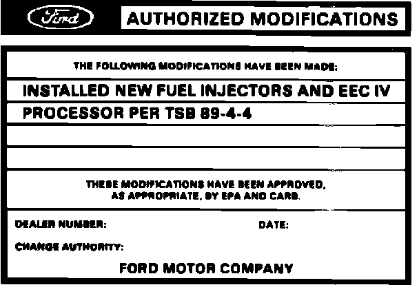 Obtain an Authorized Modification Decal and list the date, dealer number, and summary of alterations performed. Select a prominent place adjacent to the Vehicle Emission Control Information Decal suitable for installing the Authorized Modification Decal. Clean the area, install the decal and cover it with a clear plastic decal shield.