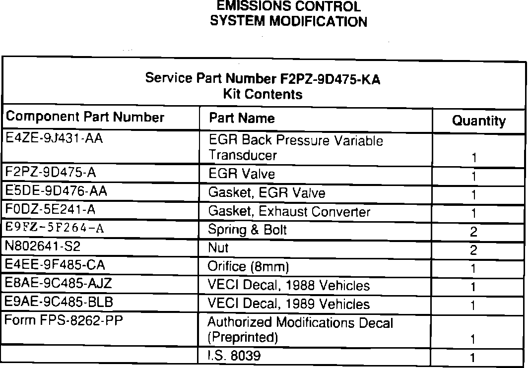 Apply VECI decal E8AE-9C485-AJZ to 1988 vehicles. Apply VECI decal E9AE-9C485-BLB to 1989 vehicles.