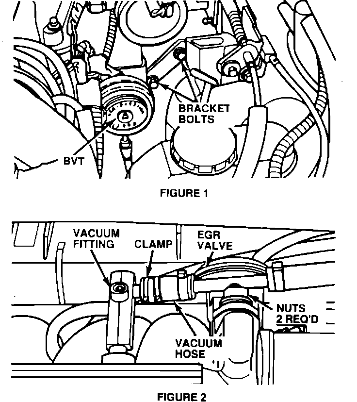 3. Remove bolts attaching EGR Back Pressure Variable Transducer (BVT) bracket to engine. (Fig. 1)