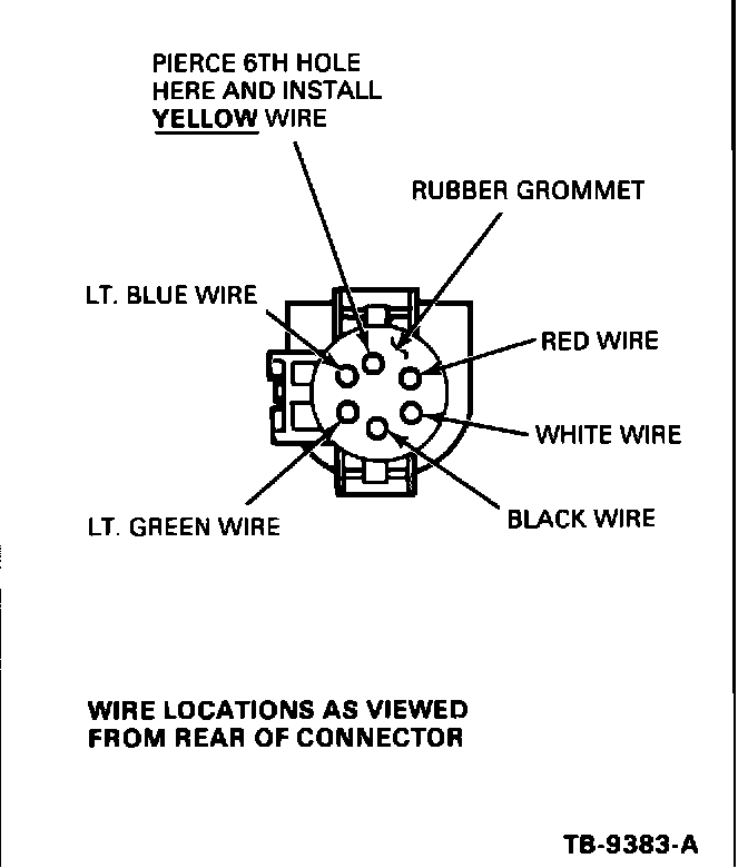 4. Feed YELLOW modification wire, supplied by OTC Division, through flexible tubing and carefully insert YELLOW wire into pierced hole. Be sure terminal end of YELLOW wire is secured by connector terminal retention tab.