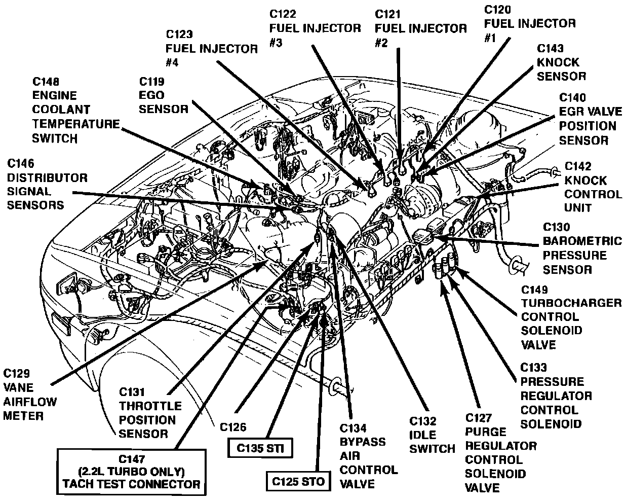 The Self Test Input (STI) connector C135 is Black, with a Red/White wire.