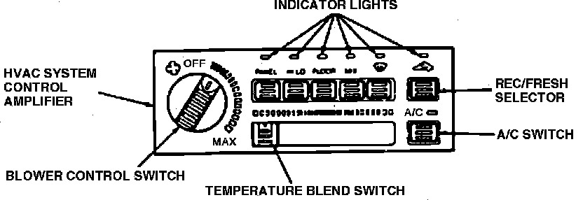 The EATC system consists of an electronic control amplifier, Fig. 1, three servo motors, three [1][2]blower motor relays, a transistor and the blower motor. The system controls blower speed, recirculated/fresh air mix, air temperature and air venting to the passenger compartment. The blower has an adjustable range controlled by the 1/2 turn speed switch. The blower fan speed is controlled by a linear power transistor. This eliminates the need of a blower motor resistor assembly.
