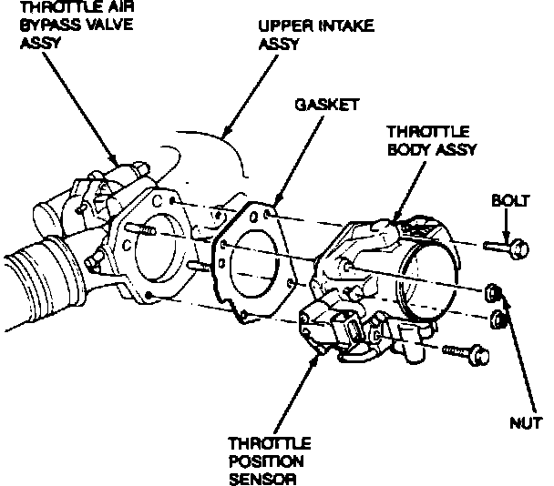 The Throttle Position (TP) sensor, mounted on the throttle body, is a potentiometer that monitors throttle plate angle and sends a signal to the Electronic Control Assembly (ECA). The TP sensor contains a pivot arm that moves along a curved resistor. One of the sensor leads supplies a five (5) volt reference signal (sent by the ECA) to the resistor. The second lead is used to ground the resistor. The third lead is for the voltage signal to the ECA.
