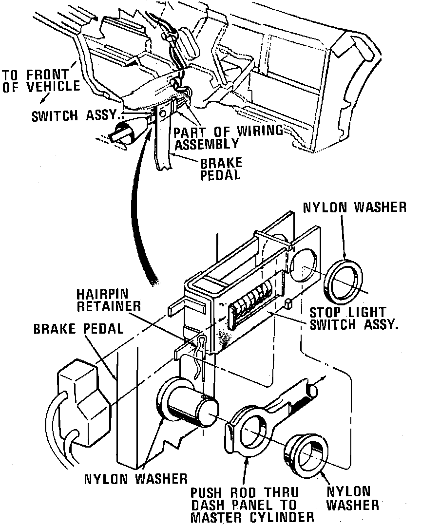3. Remove hairpin retainer, slide switch, pushrod and nylon washers and bushing away from the pedal and remove the switch, Fig. 2.