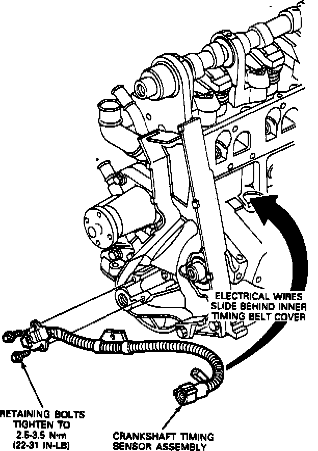 2. Position crankshaft timing sensor assembly by sliding electrical wires behind inner timing belt cover, then loosely install the retaining bolts. DO NOT tighten the bolts at this time.