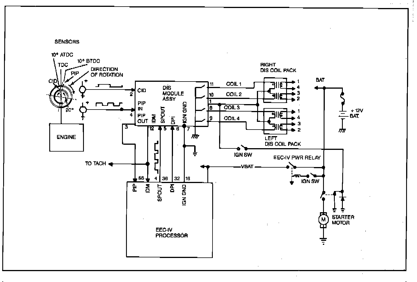 The DIS eliminates the need for a distributor by using multiple ignition coils. Each coil fires two spark plugs at the same time. The coils are paired so that as one fires during the compression cycle the other fires during the exhaust stroke. The next time the coil is fired, the plug that fired on the exhaust stroke will fire on the compression stroke and the one that was on the compression stroke will fire on the exhaust stroke (the spark in the exhaust cylinder is wasted but little of the coil energy is lost). Two coils are mounted together in a "coil pack". Each coil pack has two tach wires, one for each coil. Since there are two plugs per cylinder, two coil packs are required. One is called the Right Coil Pack (on right side of engine) and the other, the Left Coil Pack (left side). The Right Coil Pack and plugs operate continuously but the Left Coil Pack and plugs may be switched on or off by EEC-IV processor. The EEC-IV processor computes the spark angle and dwell for the ignition system.