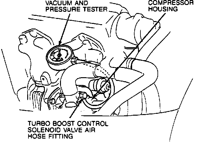 2. Disconnect air hose from [1][2]turbo boost control solenoid valve at compressor housing on turbocharger assembly. Connect vacuum and pressure tester.