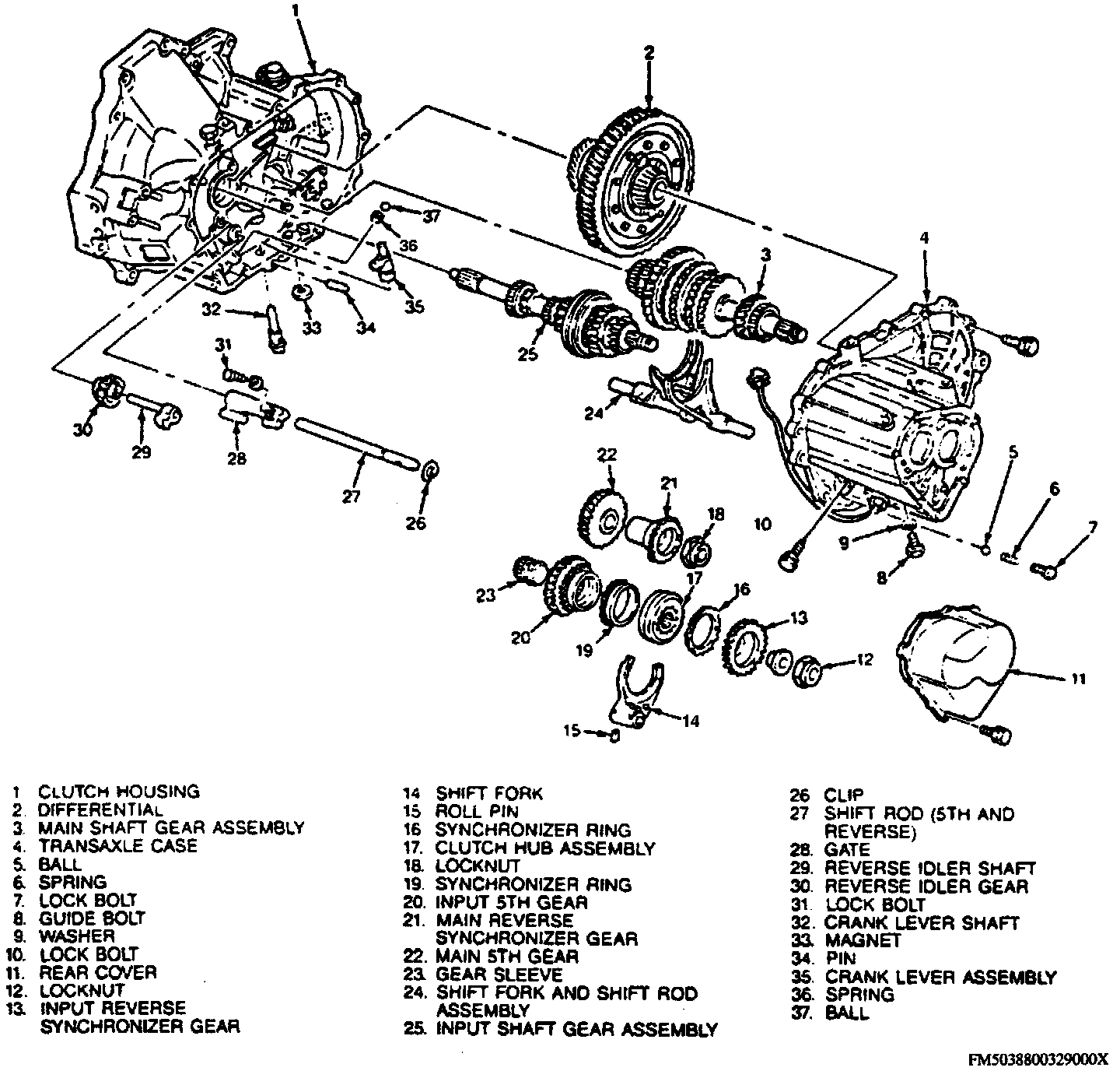 8. Remove main fifth gear, then the lock bolts, washer, guide bolt, springs, and ball.