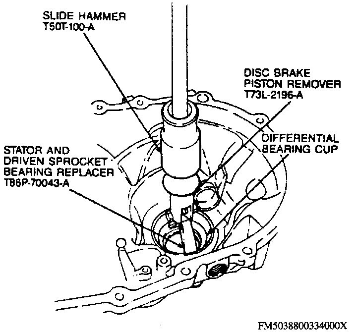 25. Remove differential bearing cups using stator and sprocket bearing replacer tool No. T86P-70043-A, disc brake piston remover tool No. T73L-2196-A and slide hammer tool No. T50T-100-A, or equivalents.