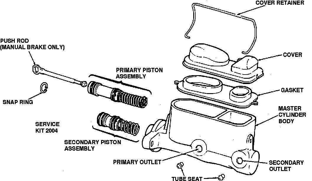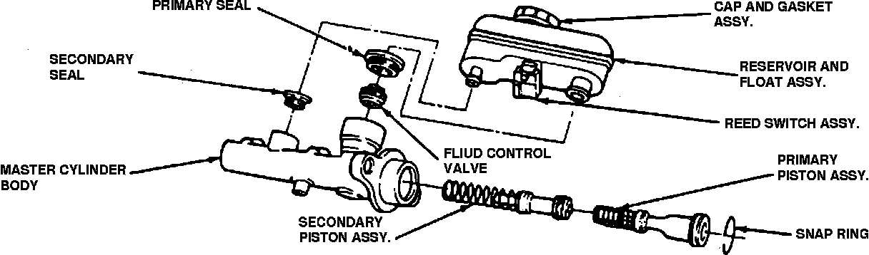 6. Remove primary and secondary piston assemblies from master cylinder. If secondary piston does not readily come out, apply air pressure to secondary outlet port to remove.